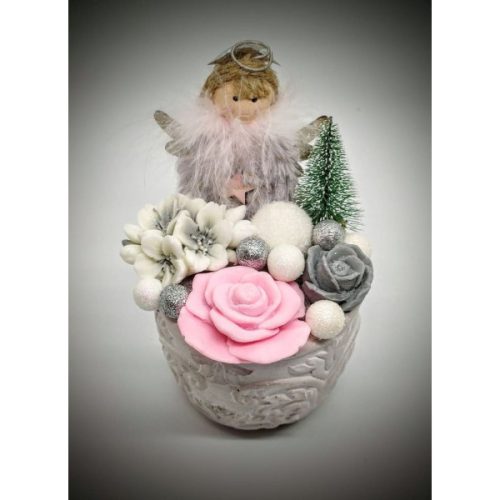 Szappanvirág csokor - karácsonyi - angyalka - rózsaszín rózsával - kő kaspóban