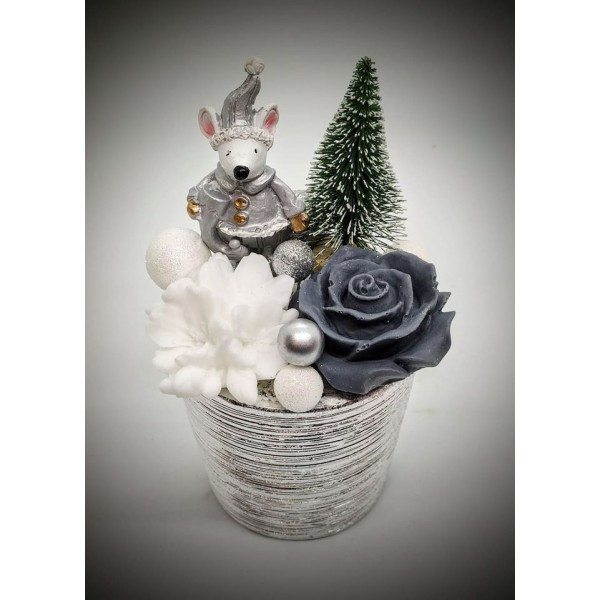 Szappanvirág csokor - karácsonyi - ezüst egérkével - ezüst kis kaspóban 2. Kézzel készített, illatos szappan csokrok, asztali díszek, egyedi szappanok és fürdősók