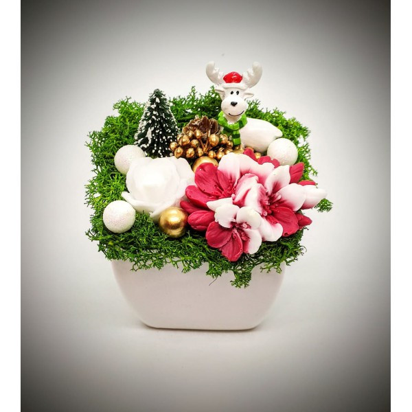 Szappanvirág csokor - karácsonyi - kicsi szarvassal - fehér kaspóban 1.