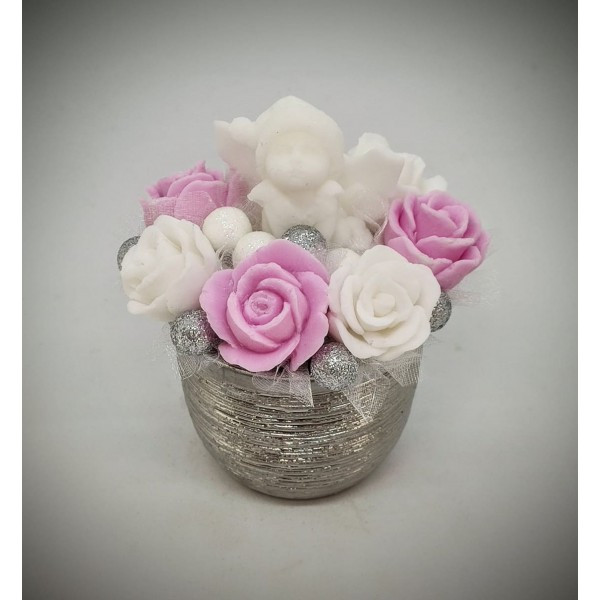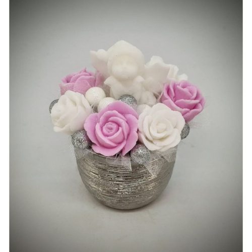 Szappanvirág csokor - karácsonyi manó - rózsaszín-fehér virággal - kis ezüst kaspóban - 3. Kézzel készített, illatos szappan csokrok, asztali díszek, egyedi szappanok és fürdősók