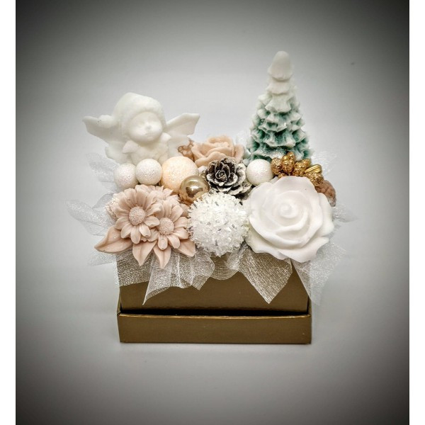 Szappanvirág csokor - karácsonyi - manóval - arany színű kis dobozban Kézzel készített, illatos szappan csokrok, asztali díszek, egyedi szappanok és fürdősók