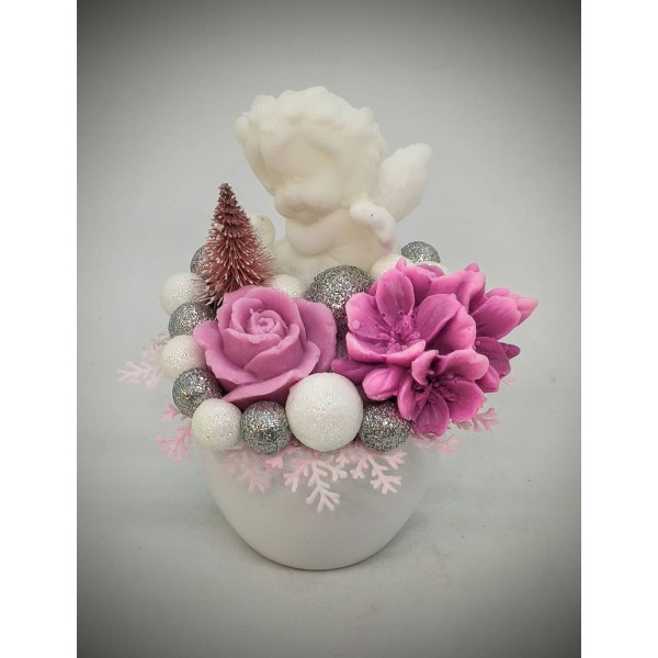 Szappanvirág csokor - karácsonyi - oldalt ülő angyalkával - fehér kis kaspóban - 2.