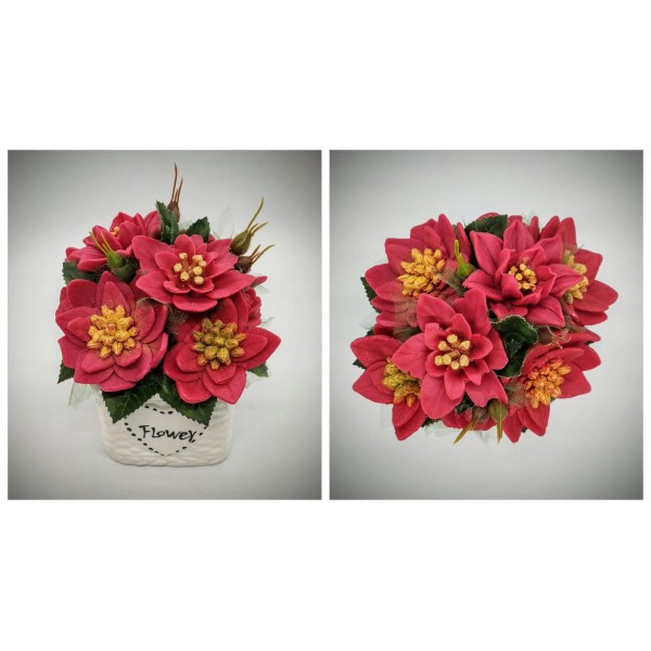 Szappanvirág csokor - karácsonyi - piros mikulás virággal - fehér kocka kaspóban