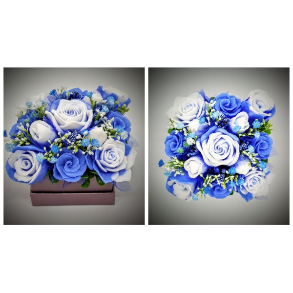 Szappanvirág csokor - kék csokor - gyöngyház lila kocka dobozban Kézzel készített, illatos szappan csokrok, asztali díszek, egyedi szappanok és fürdősók