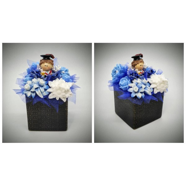 Szappanvirág csokor - Kék - fehér ballagó fiú szappanvirág csokor - fekete kocka kaspóban