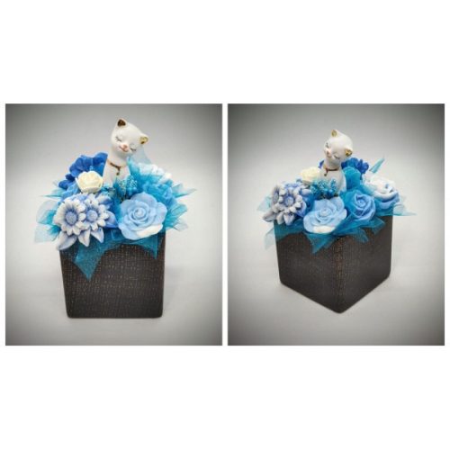 Szappanvirág csokor - Kék - fehér cicás szappanvirág csokor - fekete kocka kaspóban Kézzel készített, illatos szappan csokrok, asztali díszek, egyedi szappanok készítése.