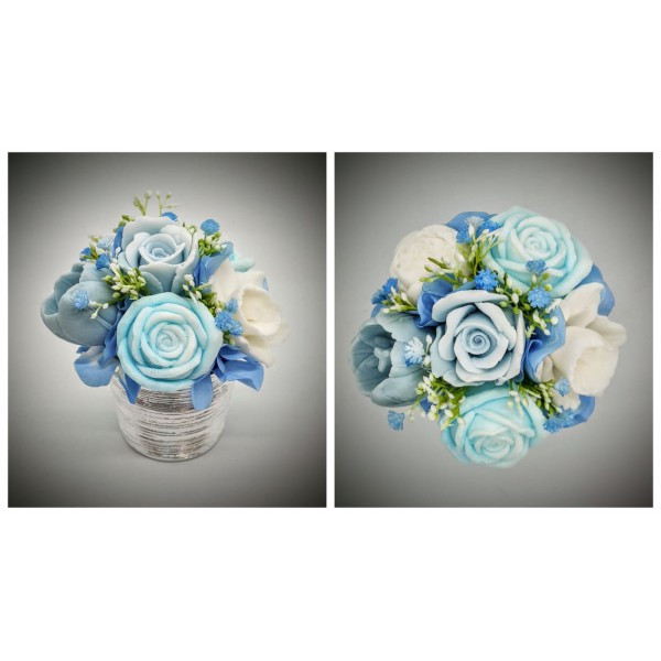 Szappanvirág csokor - kék-fehér csokor - ezüst kis kaspóban 3. Kézzel készített, illatos szappan csokrok, asztali díszek, egyedi szappanok és fürdősók