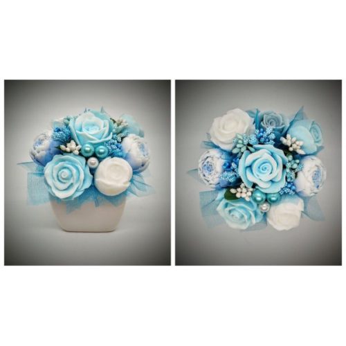 Szappanvirág csokor - kék-fehér csokor - fehér kocka kaspóban 2. Kézzel készített, illatos szappan csokrok, asztali díszek, egyedi szappanok és fürdősók