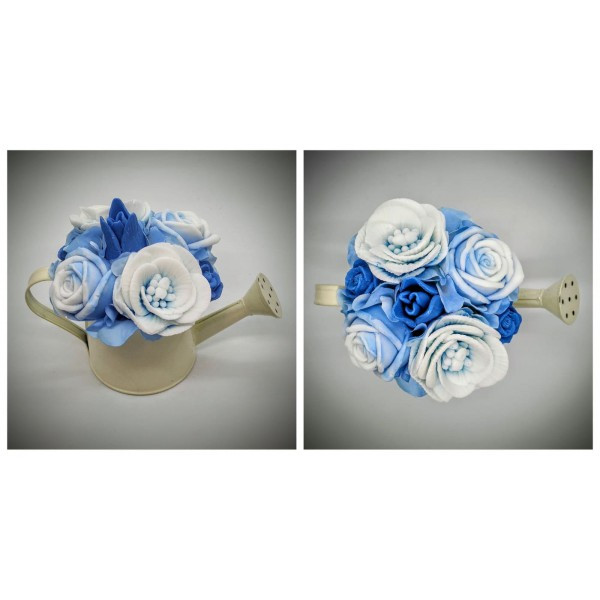 Szappanvirág csokor - kék - fehér csokor - vajszínű locsolókannában - közepes méret Kézzel készített, illatos szappan csokrok, asztali díszek, egyedi szappanok készítése.
