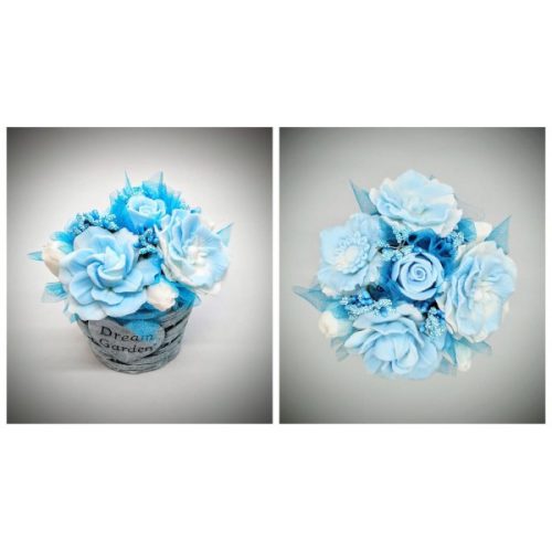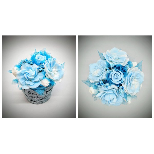 Szappanvirág csokor - Kék - fehér szappanvirág csokor - kék fonott mintás kaspóban - 2. Kézzel készített, illatos szappan csokrok, asztali díszek, egyedi szappanok készítése.