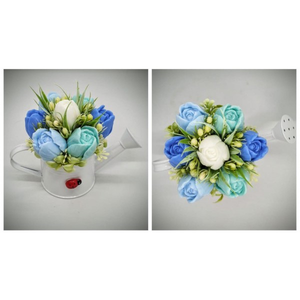 Szappanvirág csokor - kék-fehér vegyes tulipán csokor - kis fehér locsolókannában - 8. Kézzel készített, illatos szappan csokrok, asztali díszek, egyedi szappanok és fürdősók
