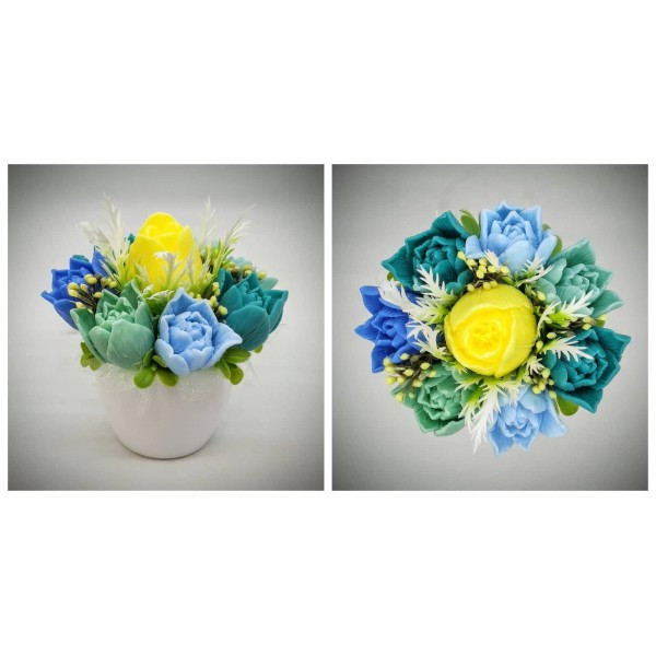 Szappanvirág csokor - kék-zöld-sárga vegyes tulipán csokor - kis fehér kaspóban - 2. Kézzel készített, illatos szappan csokrok, asztali díszek, egyedi szappanok és fürdősók