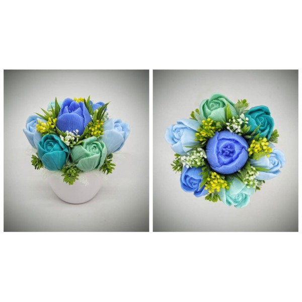Szappanvirág csokor - kék-zöld vegyes tulipán csokor - kis fehér kaspóban - 3. Kézzel készített, illatos szappan csokrok, asztali díszek, egyedi szappanok és fürdősók