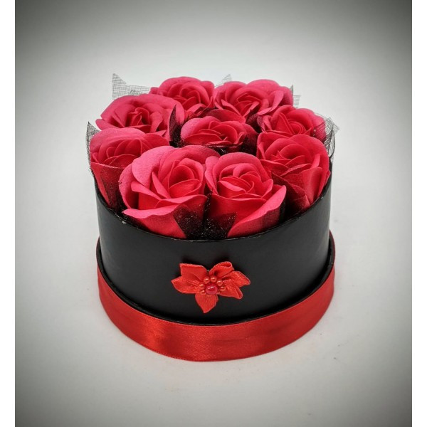 Szappanvirág csokor - kicsi piros szappanrózsa csokor - fekete kör dobozban Kézzel készített, illatos szappan csokrok, asztali díszek, egyedi szappanok és fürdősók