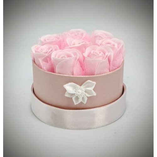 Szappanvirág csokor - kicsi rózsaszín szappanrózsa csokor - rózsaszín kör dobozban Kézzel készített, illatos szappan csokrok, asztali díszek, egyedi szappanok és fürdősók