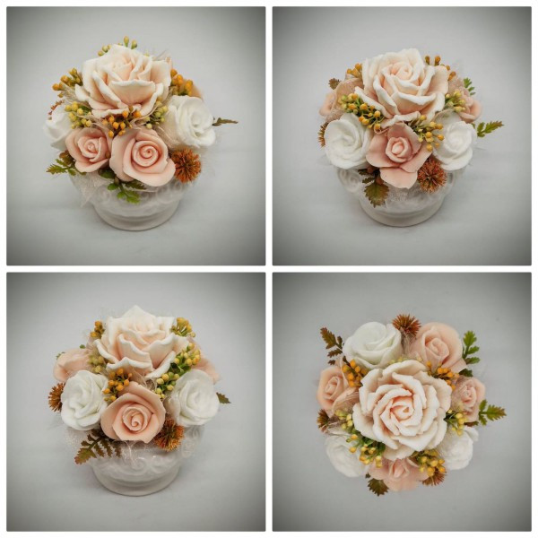 Szappanvirág csokor - kis barack-szappanvirág csokor - fehér kis kaspóban Kézzel készített, illatos szappan csokrok, asztali díszek, egyedi szappanok készítése.