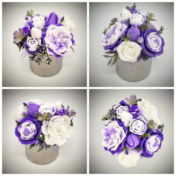 Szappanvirág csokor - lila csokor - ezüst kör kaspóban Kézzel készített, illatos szappan csokrok, asztali díszek, egyedi szappanok és fürdősók