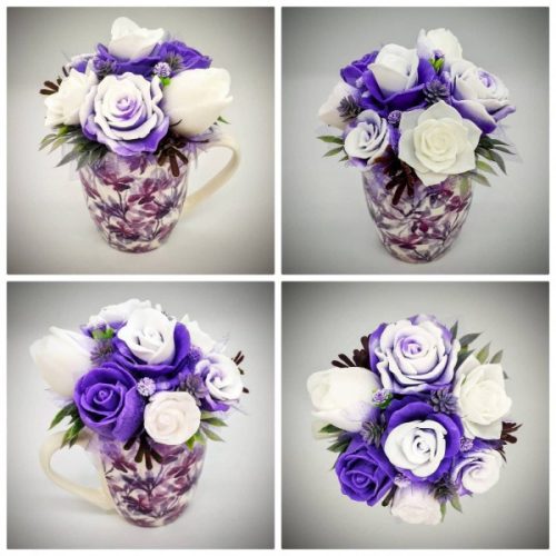 Szappanvirág csokor - lila csokor - lila mintás bögrében Kézzel készített, illatos szappan csokrok, asztali díszek, egyedi szappanok és fürdősók