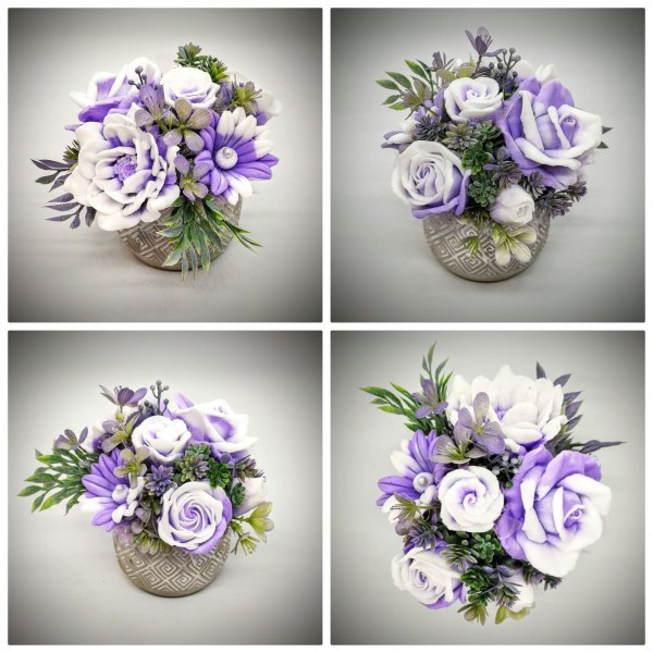 Szappanvirág csokor - lila-fehér csokor - kis kőkaspóban - 2. Kézzel készített, illatos szappan csokrok, asztali díszek, egyedi szappanok készítése.