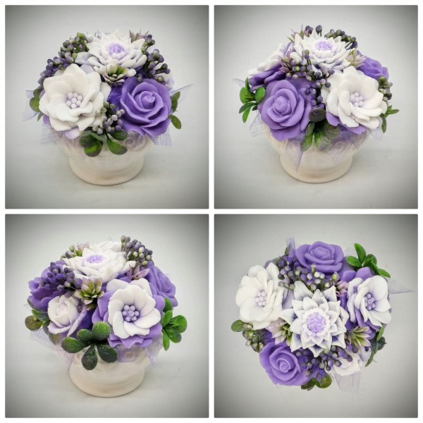 Szappanvirág csokor - lila - fehér - szappanvirág csokor - fehér kis kaspóban - 1. Kézzel készített, illatos szappan csokrok, asztali díszek, egyedi szappanok készítése.