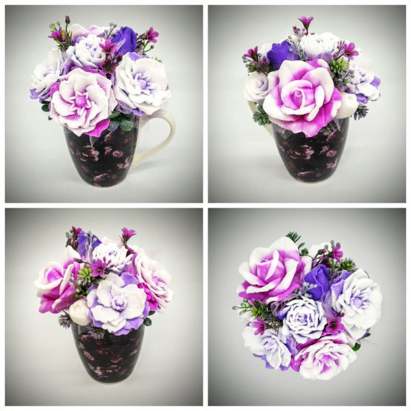Szappanvirág csokor - lila - fukszia csokor - sötét lilás mintás bögrében Kézzel készített, illatos szappan csokrok, asztali díszek, egyedi szappanok készítése.