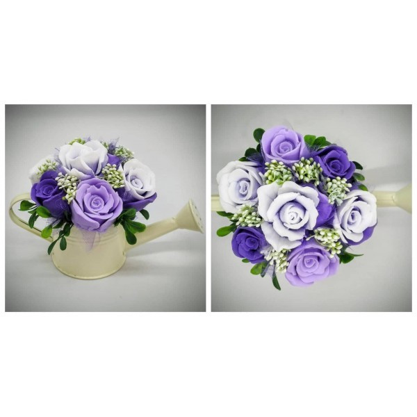 Szappanvirág csokor - Lila rózsa szappancsokor - kis vajszínű locsolókannában - 4.