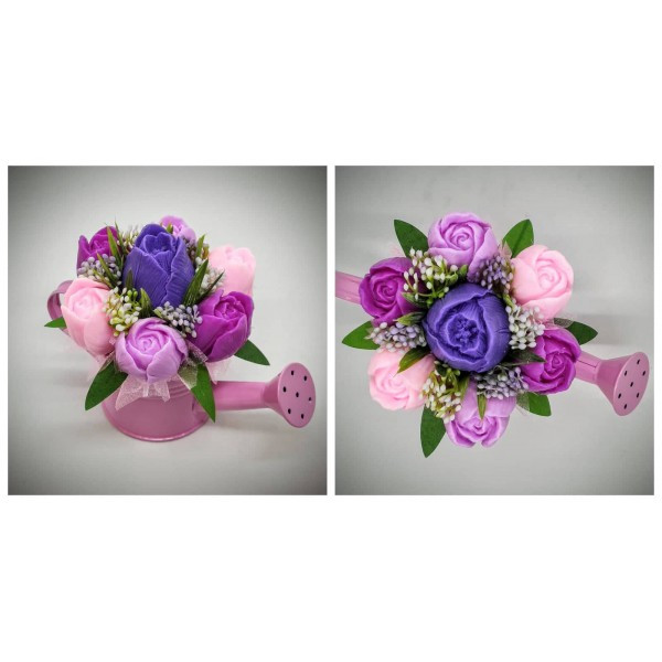 Szappanvirág csokor - Lila - rózsaszín vegyes tulipán csokor - kis rózsaszín locsolókannában Kézzel készített, illatos szappan csokrok, asztali díszek, egyedi szappanok és fürdősók