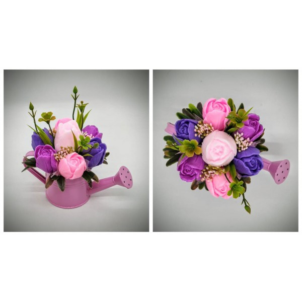 Szappanvirág csokor - Lila - rózsaszín vegyes tulipán csokor - kis rózsaszín locsolókannában - 1. Kézzel készített, illatos szappan csokrok, asztali díszek, egyedi szappanok és fürdősók