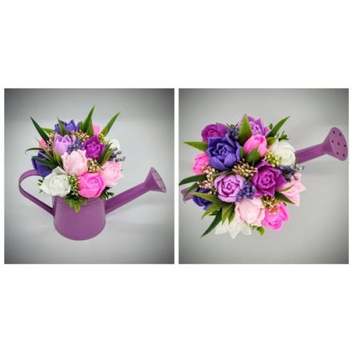 Szappanvirág csokor - lila - rózsaszín vegyes tulipán szappancsokor - lila locsolókannában - 7.