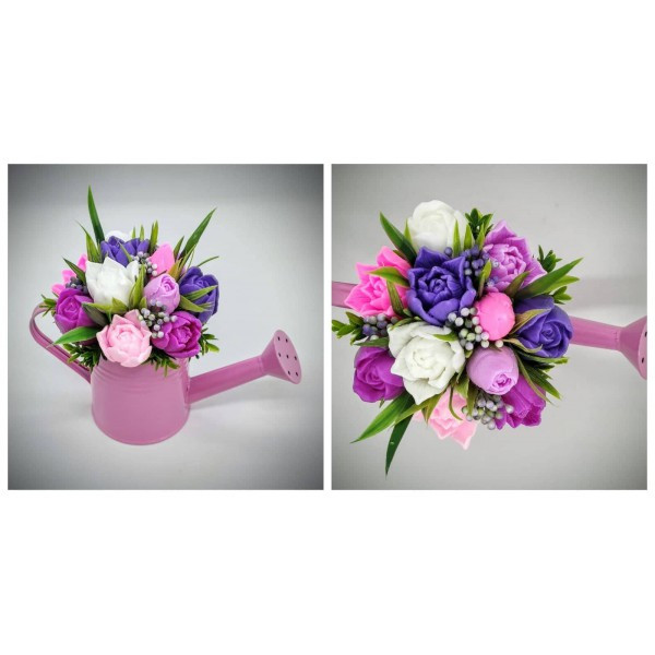 Szappanvirág csokor - lila - rózsaszín vegyes tulipán szappancsokor - rózsaszín locsolókannában - 6. Kézzel készített, illatos szappan csokrok, asztali díszek, egyedi szappanok készítése.