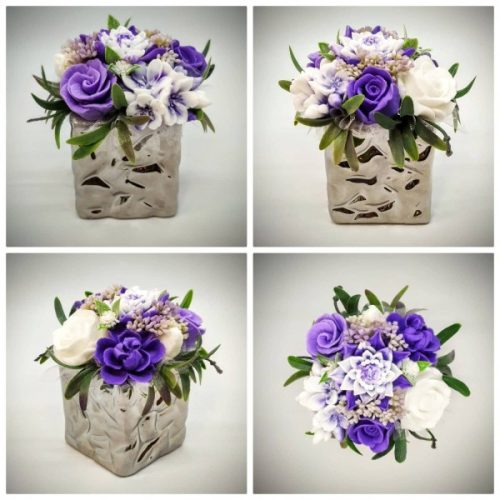 Szappanvirág csokor - Lila szappanvirág csokor - ezüst kocka kaspóban Kézzel készített, illatos szappan csokrok, asztali díszek, egyedi szappanok és fürdősók