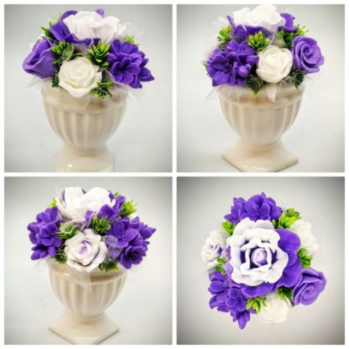 Szappanvirág csokor - Lila szappanvirág csokor - fehér kehely kaspóban Kézzel készített, illatos szappan csokrok, asztali díszek, egyedi szappanok és fürdősók