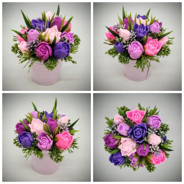 Szappanvirág csokor - lila tulipán szappanvirág csokor- lila fém kaspóban Kézzel készített, illatos szappan csokrok, asztali díszek, egyedi szappanok készítése.