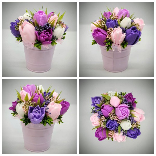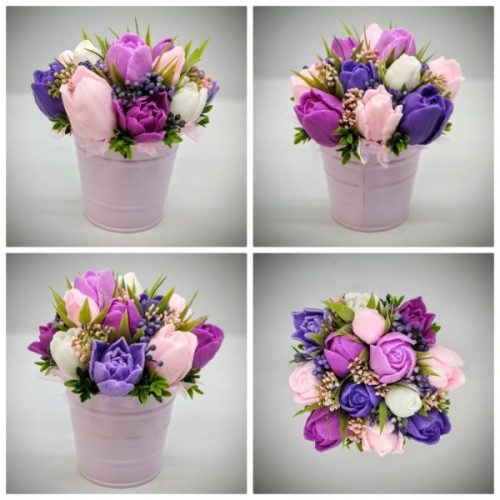Szappanvirág csokor - lila tulipán szappanvirág csokor- lila fém kaspóban - 5. Kézzel készített, illatos szappan csokrok, asztali díszek, egyedi szappanok készítése.