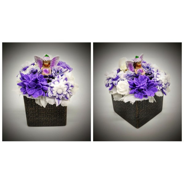 Szappanvirág csokor - lila tündérrel - fekete kocka kaspóban