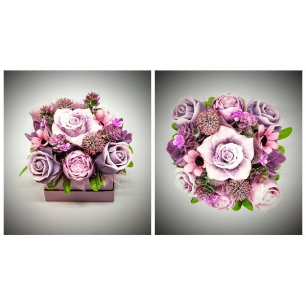 Szappanvirág csokor - lilás-mályvás rózsacsokor - gyöngyház lila kocka dobozban
