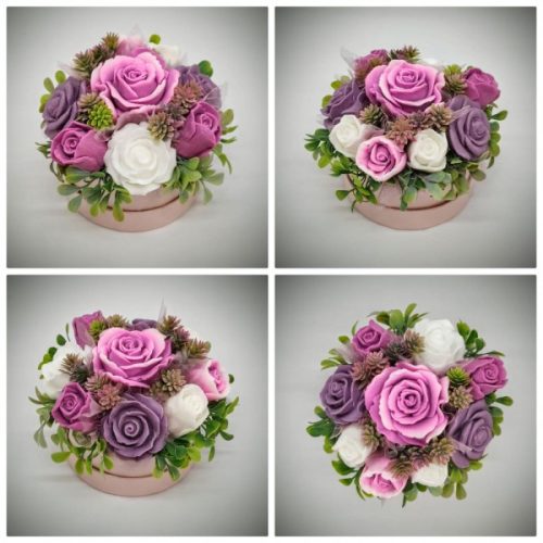 Szappanvirág csokor - lilás-mályvás szappanvirág csokor - rózsaszín kör dobozban -7. Kézzel készített, illatos szappan csokrok, asztali díszek, egyedi szappanok készítése.