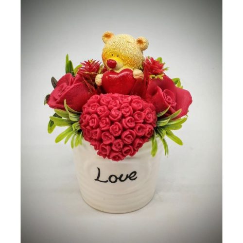 Szappanvirág csokor - maci - piros rózsás szives - zöld kiegészítővel - fehér love kaspóban -3.