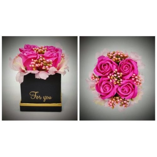 Szappanvirág csokor - magenta szappanrózsa csokor - fekete kis kocka dobozban Kézzel készített, illatos szappan csokrok, asztali díszek, egyedi szappanok és fürdősók