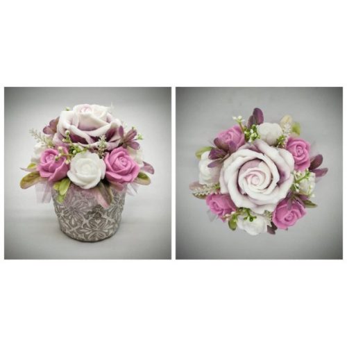 Szappanvirág csokor - mályva rózsacsokor - kis kőkaspóban - 5. Kézzel készített, illatos szappan csokrok, asztali díszek, egyedi szappanok készítése.