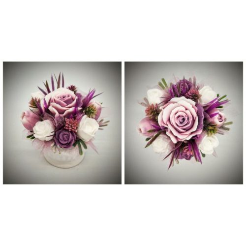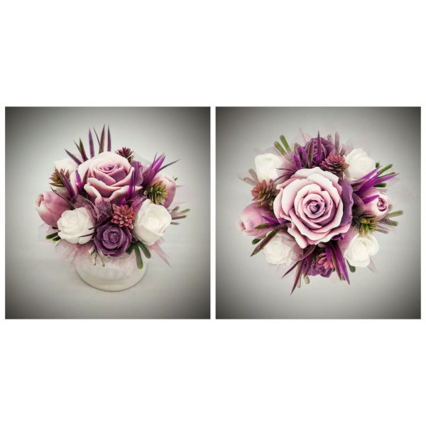 Szappanvirág csokor - mályva színű csokor - kis fehér kehely kaspóban - 2. Kézzel készített, illatos szappan csokrok, asztali díszek, egyedi szappanok készítése.