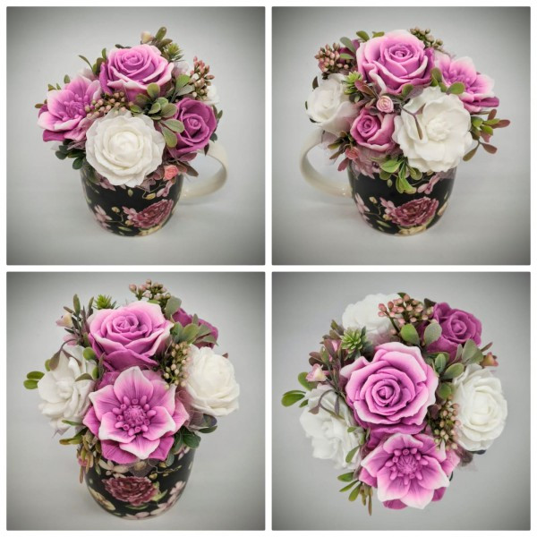 Szappanvirág csokor - mályvás-lilás szappanvirág csokor - fekete virágos bögrében - 4. Kézzel készített, illatos szappan csokrok, asztali díszek, egyedi szappanok készítése.