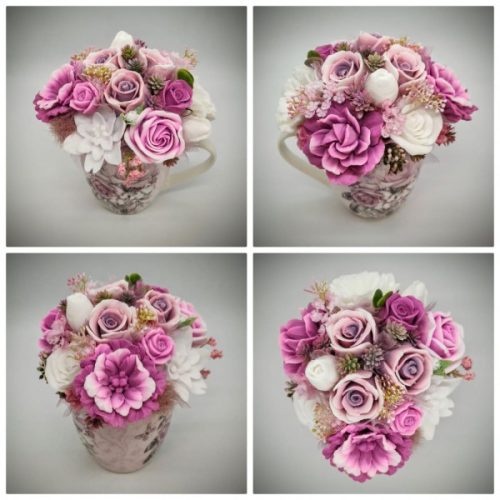 Szappanvirág csokor - mályvás-lilás szappanvirág csokor - rózsás bögrében - 1. Kézzel készített, illatos szappan csokrok, asztali díszek, egyedi szappanok készítése.