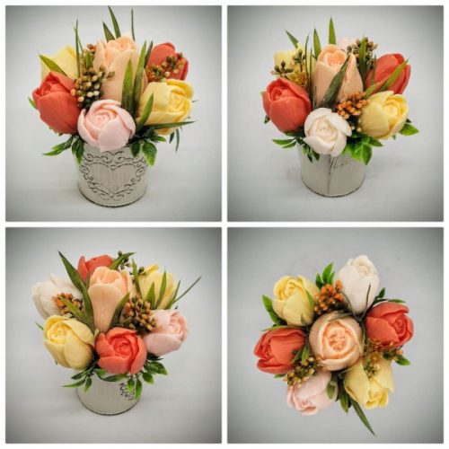 Szappanvirág csokor - narancs-barack-sárga tulipán szappanvirág csokor - kicsi fém kaspóban - 2. Kézzel készített, illatos szappan csokrok, asztali díszek, egyedi szappanok készítése.