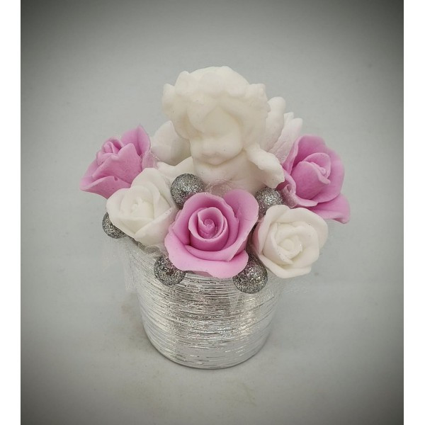 Szappanvirág csokor - oldalt ülő angyalka - rózsaszín-fehér virággal - kis ezüst kaspóban - 2.