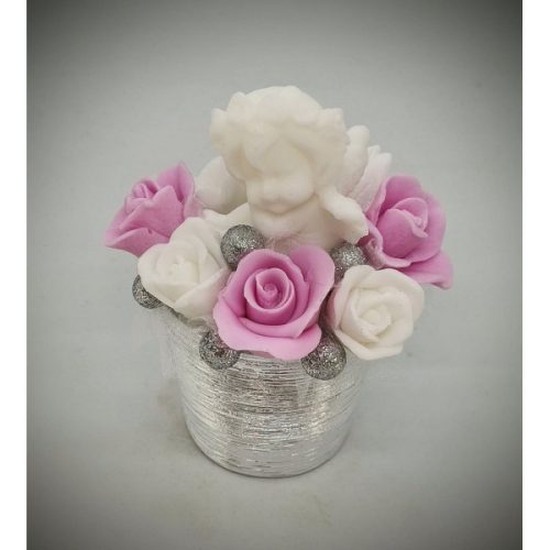 Szappanvirág csokor - oldalt ülő angyalka - rózsaszín-fehér virággal - kis ezüst kaspóban - 2. Kézzel készített, illatos szappan csokrok, asztali díszek, egyedi szappanok és fürdősók