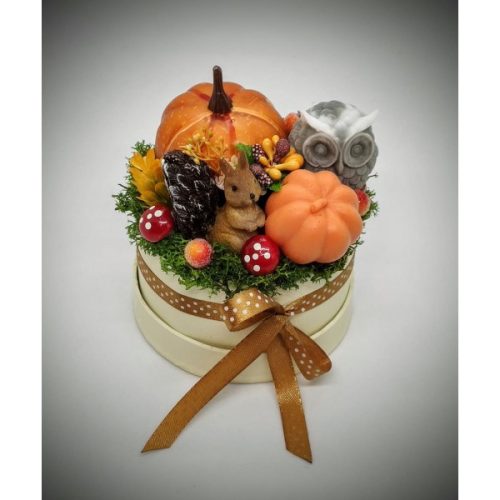 Szappanvirág csokor - Őszi csokor - mókussal - kör dobozban Kézzel készített, illatos szappan csokrok, asztali díszek, egyedi szappanok és fürdősók