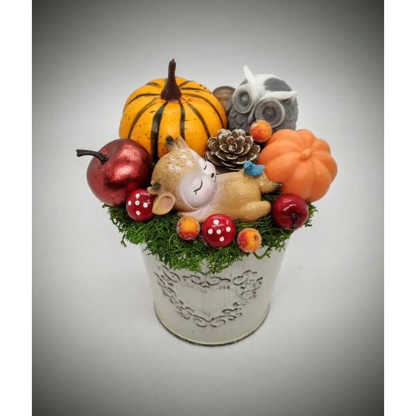 Szappanvirág csokor - Őszi csokor - őzikével - fém kaspóban
