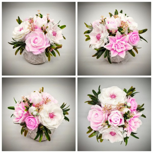 Szappanvirág csokor - pink-fehér szappanvirág csokor - fehér kőkaspóban Kézzel készített, illatos szappan csokrok, asztali díszek, egyedi szappanok és fürdősók