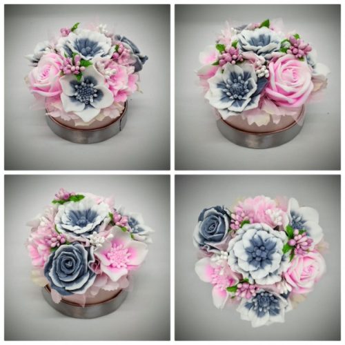 A szappant, amiből a virágok készülnek, egyedileg színezem, illatosítom és öntöm formába, majd ezekből az elkészült szépségekből állítom össze a csokrokat, boxokat.Választható szinekben, több különböző illattal rendelhető.